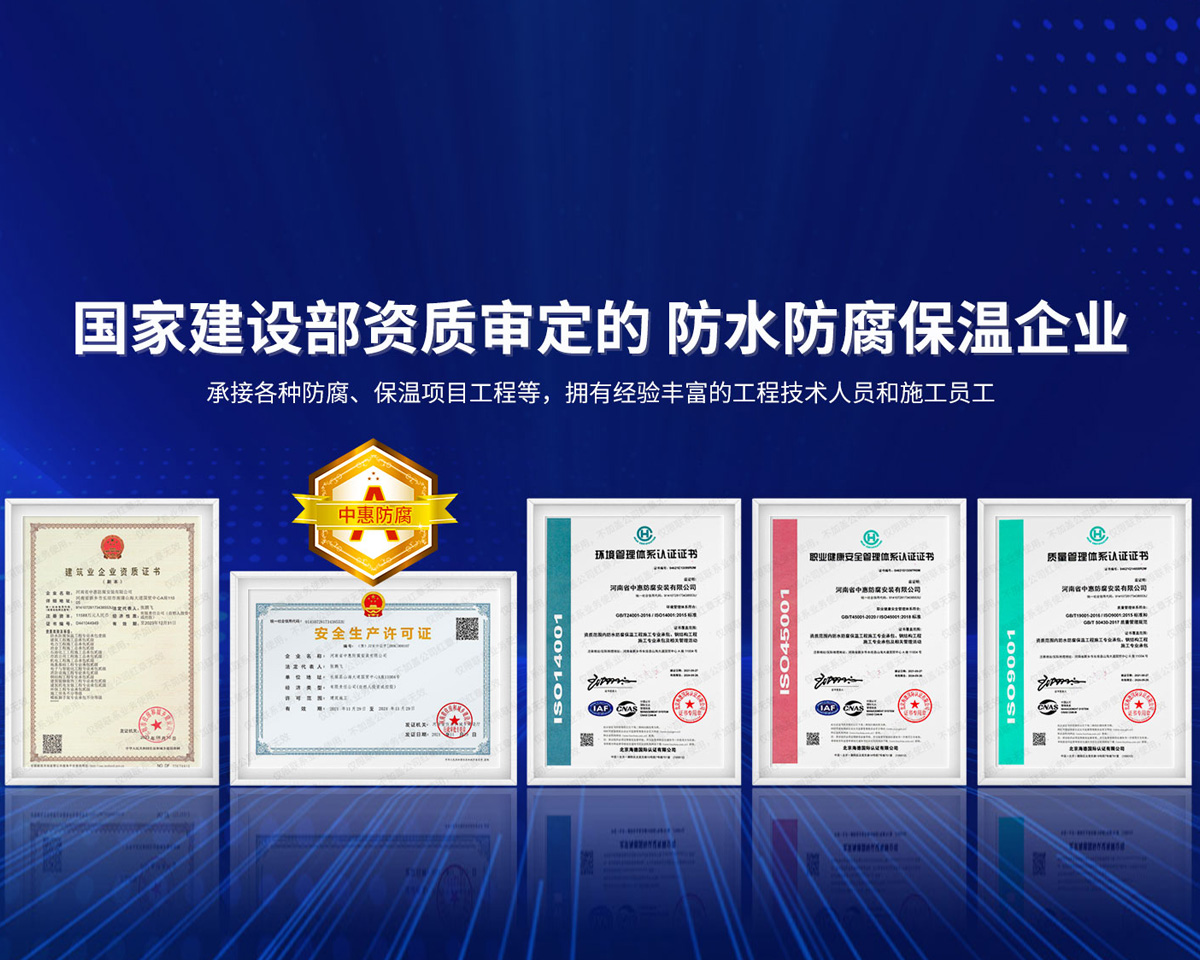 公司經營范圍:防水防腐保溫工程;消防設施工程;建筑裝修裝飾工程;建筑機電安裝工程;電力工程;建筑工程;石油化工工程;工業清洗工程;油罐清洗工程;鋼結構工程;環保工程;模板腳手架工程;電纜防火封堵、防污閃噴涂、外墻外保溫工程;各類施工勞務作業;設備維修、船舶鉚焊、涂裝;電力工程材料、建材、防水材料、防火材料、防腐保溫材料銷售,并相繼通過了GB/T19001-2008idtISO9001:2008GB/T50430-2007質量管理體系認證證書。GB/T24001-2004idtISO14001:2004環境管理體系認證證書。GB/T28001-2011idtOHSAS18001:2007職業健康安全管理體系認證證書。公司是中國防腐蝕于防護協會、中國施工企業管理協會、電力協會和中國鋼結構防水協會會員單位。 公司的經營業務涵蓋了石油、化工、電力、冶金、煤炭、船舶、國防、燃氣、水利、環保、交通運輸、航空及國防軍工和輕紡市政等行業的防腐保溫絕熱設備。鋼結構安裝、防火、防水、金屬噴鍍、聚脲噴繪、陰極保護、防滲透堵漏、玻璃鋼及各種磚版材料襯里、橡膠襯里、煙氣硫和耐酸溶劑腐蝕等工程施工。公司連續十年榮獲“省市先進施工企業”“安全生產先進單位”“重合同,守信用企業”和“AA***資質企業”的稱號。2000年被命名為市級文明單位,2002年被國家工商行政管理局命名為“重合同,守信用的企業”、被中國工業防腐蝕技術協會命名為“防腐蝕企業,能源節約及環境保護領域有豐富的經驗和***的業績。工程一次交驗合格率100%。其中攀枝花鋼鐵公司煉鐵廠四號高爐及熱風爐防腐工程、上海寶鋼公司煤氣柜防腐工程、撫順石油一廠裝置防腐項目、齊魯石化公司稀烴廠高塔防腐工程、吉林化學工業公司煉油廠油罐防腐工程、天津石化熱電廠六號爐頂棚聯絡管保溫工程、大慶油田(太倉)力神泵業工程、中國化學工程第十一建設工程、中原油田勘探局工程、中國石化銷售有限公司華北分部、魯皖輸油管道工程、貴州開磷息烽合成氨工程、陜西黃陵煤化工程、中國石油天然氣西部管道塔里木輸油工程、邯鋼集團邯寶鋼鐵公司煉鐵工程、德州供電工程、吉寶(南通)船廠工程,偃師華潤熱力工程、鄭州熱力總公司。 河南省中惠防腐安裝有限公司愿以豐富的施工經驗,***的技術,***的設備,***的管理,***的服務,竭誠為國內外廣大的用戶提供***滿意、******的工程作品。 我公司愿與國內外同仁一道,團結協作,共同推進防腐蝕行業發展! 公司地址:河南省長垣縣建設路北段360號 固定電話:0373-8866488 郵編:453400 網址:http://www_zhff_com_cn.szxbaowen.com